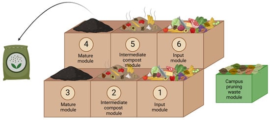 The Arrosadia campus of UPNA has a central canteen building where more than 500 meals are prepared and consumed every day from Monday to Friday during the academic year (from September to July). In addition to the kitchen where the meals are prepared and the self-service canteen, the building also has a cafeteria. All the biowastes generated in the building are separated and kept separate from the rest of the waste generated in the building. In 2019, an outdoor community composting site was installed 5 m from the door of the kitchen place in the building to manage biowaste from the campus (Figure 1). The community composting site consisted of 6 composting modules, each with a capacity of 1 m3 (1 m long × 1 m wide × 1 m high), forming a batch system with two parallel management lines. Each of the management lines comprises three composting modules. The first management line is constituted by the input module 1, the intermediate compost module 2, and the maturation module 3. The second management line is formed by the input module 6, the intermediate compost module 5, and the maturation module 4. Daily biowaste, mainly food waste, is stored in the input module 1 or 6 (Figure 2).