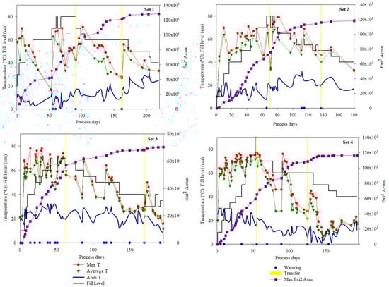 In addition, the degree of exothermicity was assessed using the cumulative quadratic exothermicity index (EXI2) [32], which indicates the intensity of the bio-oxidative phase (Figure 3). This index was determined as the quadratic sum of the daily difference between the temperature inside the set and the temperature of the environment during the bio-oxidative phase of composting [32]. Sets 1, 2, and 3 obtained the highest EXI2 value with 127,252, 118,568, and 116,225 °C2, respectively, while set 3 showed the lowest value with 70,289 °C2. The sets with the highest values obtained (sets 1 and 2) were the ones with the highest amount of waste managed (in kg, Table 1). The incorporation of important quantities of waste produced a raise in the temperature values during the process and enhanced its maturity [30]. This EXI2 value was in the range of those recorded by Alvarez-Alonso et al. [21] during composting of organic fraction of municipal solid waste and, consequently, lower than those recorded by Vico et al. [32] and Pelegrín et al. [33] in composting processes using agro-industrial organic wastes. As observed by Wang et al. [27] in small-scale composting, all the composting sets showed a slight reactivation of the process after each addition of material and subsequent mixture, although only in set 2 was this increase higher than the temperatures reached during the first few days of the process. This reactivation was greater in the cases where the material was transferred to the next composting module and irrigation was also applied.