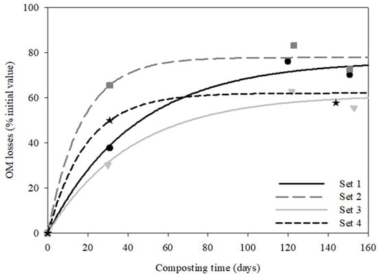 Organic matter (OM) losses (%) in the composting sets. Lines represent the curve fitting for each set.