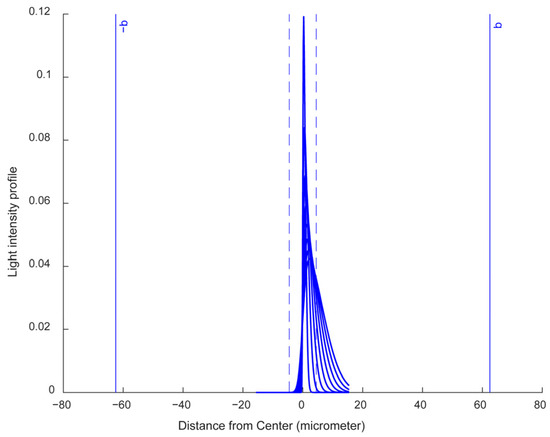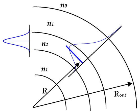 Figure 2 shows the light intensity profile for multiple bending radiuses from R = 100 µm to R = 1800 µm. The core radius a = 4.5 µm, the cladding radius b = 62.5 µm,