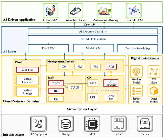 The cloud–network functional domains encompass the cloud, RAN, CN, and network management systems, each embedded with AI capabilities. In the 3GPP framework, the CN introduces a new network function called the Network Data Analytics Function (NWDAF) [12] to enable data analytics. On the RAN side, AI functionalities are implemented through gNB [9], while Operations, Administration, and Maintenance (OAM) systems are responsible for AI management and utilize the Management Data Analytics Function (MDAF) for management data analysis [11]. The O-RAN introduces additional network functions, such as near-real-time RIC and non-real-time RIC, to enable AI functionalities in the RAN domain. Looking ahead to the evolution of networks, it is anticipated that, in the 6G era, components such as the CU control plane, DU, and certain CN functions will natively integrate AI capabilities. This end-to-end integration will enhance network intelligence, providing a unified platform for efficient and adaptive operation.