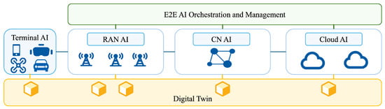 The evolution of communication systems is primarily influenced by service requirements. As shown in Figure 1, the International Telecommunication Union Radiocommunication Sector (ITU-R) report identifies the integration of communication and artificial intelligence (AI) as one of the new use cases for sixth-generation (6G) mobile networks [1,2]. Future 6G mobile networks will pursue higher data speeds at a gigabit-per-second magnitude [3]. To support the vision of 6G networks, AI will become a key enabler for various 6G applications and scenarios. As intelligent applications evolve, next-generation networks are anticipated to thoroughly integrate AI, information technology (IT), and communication technology (CT), which are referred to as AICT in this paper. This transition is converting the communication system from traditional data pipelines into intelligent service platforms [4,5]. In the era of fifth-generation mobile networks (5G), the integration of IT and CT has already been explored through concepts such as cloud–network convergence and service-based architectures [6,7]. Building upon this foundation, AICT is introducing AI technologies to further enhance the intelligence of communication systems.