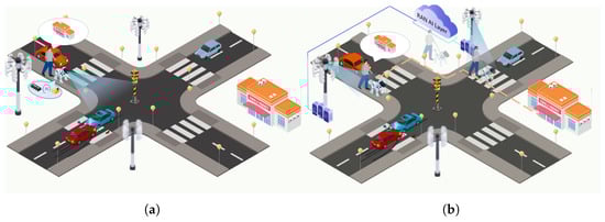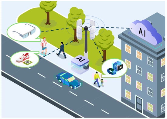 With the rapid growth of AI technology and edge computing, network intelligence is gradually moving towards the edge, giving rise to AI-enabled wearable devices. ‘Wearable devices’ typically refers to electronic devices worn on the body, which are employed to monitor and transmit collected information about consumer behaviors and activities in an environment. Wearable devices often integrate various sensors, such as temperature sensors, accelerometers, gyroscopes, and heart rate sensors, to collect personal data and improve daily life. As shown in Figure 5, the base station collects data from the wearable devices, which may encompass earphones, watches, glasses, and footwear. Empowered by AI chips embedded at the base station, user terminals will be provided with real-time intelligent analysis, such as route advice on avoiding a traffic accident ahead.