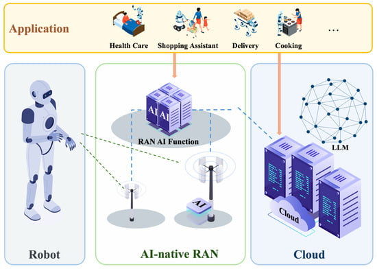 Figure 7 illustrates an example of an AI-driven network for robotic guide dogs, demonstrating how cloud–edge–terminal AI collaborates to enhance intelligent assistance services for robotic guide dogs. Approximately 43 million individuals are blind globally; however, only about 22,000 guide dogs are actively employed to assist this population. Robotic guide dogs, enhanced by AI technologies, present a promising alternative. These robotic systems, typically powered by embedded units such as Raspberry Pi or Jetson, handle tasks like obstacle detection and path planning. However, these systems are constrained by limited computing resources and insufficient adaptability to dynamic environments. The AI-native RAN offers a possible solution by offloading intensive AI processing tasks to distributed RAN nodes. This approach not only reduces energy consumption and computing pressure on terminals, but also addresses the social challenges of providing more accessible assistance to persons with disabilities. Without the AI-native RAN, all AI capabilities are concentrated on the terminal, requiring it to handle sensing, decision-making, path planning, and human–machine interaction independently. This imposes extremely high requirements on the device’s computing capacity and performance. Compared to terminals, the RAN can perceive and acquire environmental information on a larger scale. With the assistance of RAN AI, it can execute AI tasks such as path planning, incident detection, and localization, and provide smarter and safer services for visually impaired individuals.