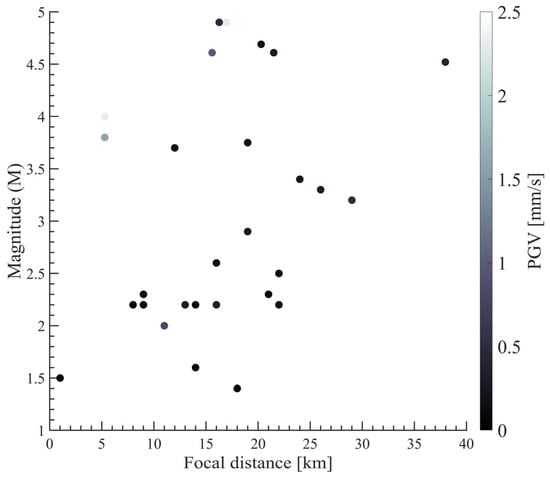 Distribution of selected earthquake records in terms of epicentral distances, M, and PGV.