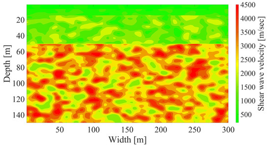 To simulate the site effect representing the spatial variability of the target site, the Gaussian model was used. MATLAB R2022a, a numerical computation platform for data analysis and algorithm development, was employed to generate the Gaussian random field [15]. For random field generation, the target reference Vs profile is defined, and the CV is calculated using the standard deviation of the obtained Vs profiles. Horizontal and vertical CL are also used as input parameters. The Gaussian random field is generated using these variables and follows a Gaussian correlation function ρ(τ), which depends on the separation distance τ, as expressed below [16]: