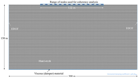 The element size was determined according to the criteria proposed by Kuhlemeyer and Lysmer [21], ensuring accurate simulation of seismic wave propagation up to the maximum frequency of interest, which was set to 50 Hz. The element size applied was 1 m in both width and height. Figure 4 shows the developed computational model with a depth of 150 m. Because the depth of the numerical model may influence of the calculated coherency, it was changed from 50 m up to 200 m, the results of which are presented in Section 3. The range of nodes used for coherency analysis was defined based on the maximum separation distance of the array installed at the Pinyon Flat site [1].