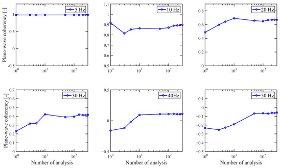 Since random fields were used, it is important to select an appropriate number of probabilistic analyses to obtain reasonable results. The number of numerical simulations was determined by the 30 input ground motions and the number of random field realizations. To determine the optimal number of random field realizations, a convergence evaluation was conducted. Figure 5 shows the results of this sensitivity analysis. The results indicate that stable estimates can be achieved when more than 150 analyses are performed up to the 50 Hz range. Therefore, this study conducted a total of 150 analyses for the coherency evaluation, combining 30 input ground motions with five realizations.
