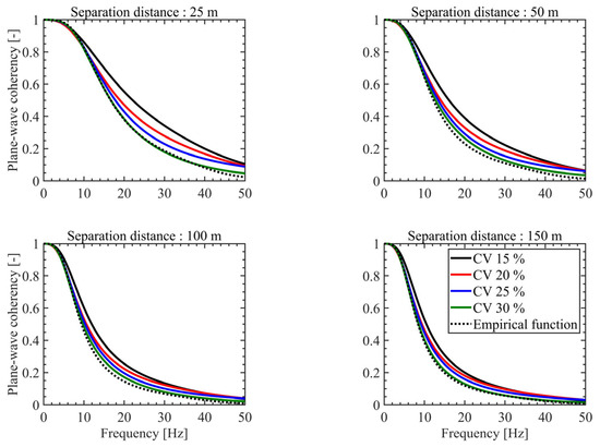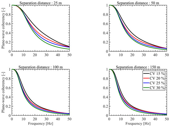 Figure 6 presents the results of the sensitivity analysis of plane-wave coherency with respect to the CV. The analysis shows that plane-wave coherency decreases as the CV and separation distance increase. This trend is likely due to increased site heterogeneity and seismic wave scattering caused by the spatial variability of Vs and the greater separation distance. This can be interpreted as a decrease in coherency resulting from increased phase differences and interference among individual seismic wave components as the CV increases. Similar patterns have been observed in soil sites with relatively lower stiffness [23]. This suggests that the CV strongly influences coherency regardless of site conditions. Therefore, careful consideration is required when selecting and applying the CV in the development of numerical coherency models for incoherency SSI analysis.