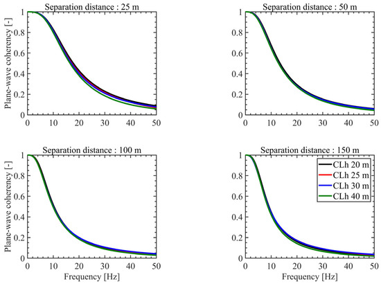 Figure 7 shows the results of the sensitivity analysis of plane-wave coherency with respect to the horizontal correlation length (CLh). Given that the CLh has a greater impact on ground motion coherency than the CLv, the analysis was conducted by fixing the CLv at 10 m and varying the CLh from 20 m to 40 m. The results indicate that the influence of the CLh on plane-wave coherency is minimal as the CLh increases. This suggests that when the size of the heterogeneity is small relative to the wavelength (i.e., when the CLh is small), the scattering effect of seismic waves due to heterogeneity is reduced, and the influence of separation distance on plane-wave coherency is limited. Especially in the low frequency range, an increase in the CLh has no effect, as the long wavelength seismic components are less influenced. That is, while a larger CLh increases the scale of individual heterogeneities, it does not significantly affect coherency in cases with long wavelengths, such as rock sites. This suggests that when developing numerical coherency models, applying an excessively high CLh value is unlikely to impact coherency.