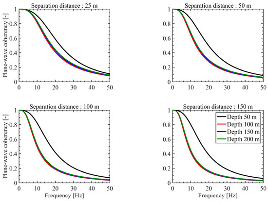 In numerically deriving the coherency function, the depth of the model may influence the surface variability. However, the effect of the depth of the numerical model has not yet been investigated. To assess its impact on plane-wave coherency, a sensitivity analysis was conducted for depths ranging from 50 m to 200 m. Figure 8 presents the results of the sensitivity analysis with respect to the analysis depth for CV = 20 and CLh = 20. The results indicate that when the analysis depth exceeds 100 m, the calculated coherency converges and that further increases in depth have a marginal influence on the calculated response. This suggests that when the physical properties and spatial variability of the site remain constant, the analysis results converge once the depth exceeds 100 m. However, this result applies only to the Pinyon Flat site. In practice, borehole depth and Vs profile data vary significantly across sites. Therefore, a sensitivity analysis on the depth of the model should be conducted when developing a numerical coherency model.
