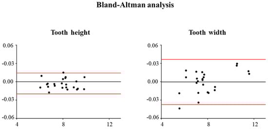 Bland–Altman analysis of the measurements of tooth heights and widths between the plaster and digital models.