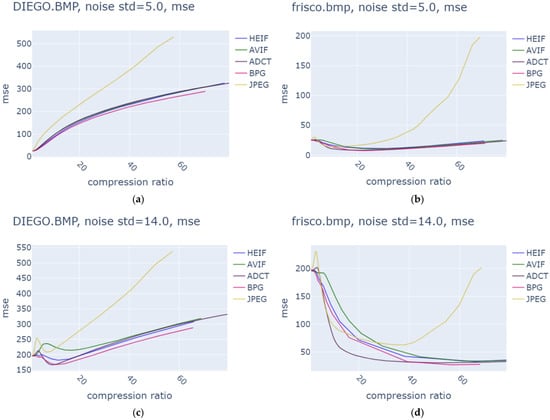 Figure 2 presents the dependences of the MSE calculated between the compressed and true images on the CR for two test images and two values of , 25 and 196, for five coders. As can be observed, OOPs were observed for all five coders (including the advanced DCT-based coder ADCT [58]) for both noise variances for the test image Frisco as well as for three coders (including HEIF) for the test image Diego, contaminated by AWGN with .