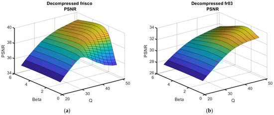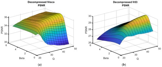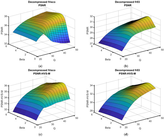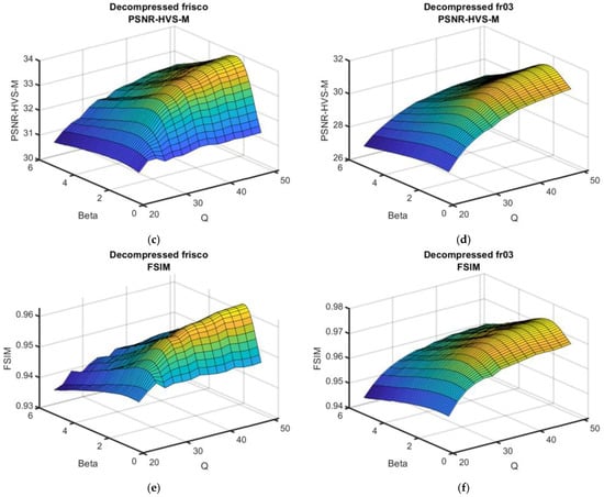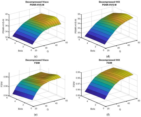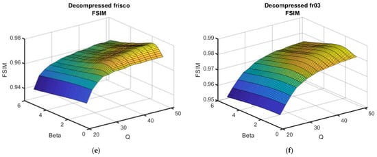 As can be seen, the surfaces are smooth, and the maxima in the neighborhood of the optimal β are not “obvious” (i.e., for β, which slightly differed from βopt, the performance was practically the same as for βopt). This means that errors in setting β do not considerably influence the post-filtering efficiency. Meanwhile, the reduction in the metric output values with QF decreasing was not rapid for QF = 40, but the reduction speed increased for a smaller QF.