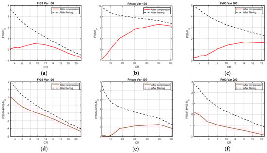 Post-filtering can be useful only under certain conditions (i.e., if it is efficient enough and if the provided CR is appropriately large). Because of this, we did not consider a QF > 51, for which the provided CR was small (see data in Table 1). Meanwhile, we also did not analyze a QF < 23, since it was expected that the filtering efficiency would be low [49]. In other words, we studied the behavior of post-filtering efficiency for the neighborhood of the optimal operation point (if it existed, see data in Table 2) and for a QF that produced a smaller CR than in the OOP. Namely, the interval of QF analysis was from 23 to 51.