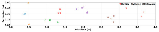 Clusters (represented by distinct colors) and outliers obtained using DENC with = 0.300 m and = 0.150 m—example problem.