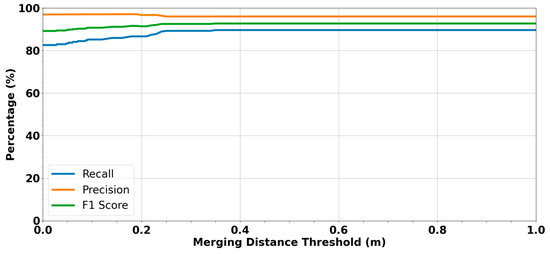 Sensitivity of the proposed DBSCAN-based alternative model to the merging distance threshold using = 0.250 m, = 0.110 m, = 0.055, and = 0.001—case study.