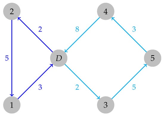 CVRPTW includes two additional constraints: vehicles possess a maximum carrying capacity (C), and clients may only be served during predefined time windows (TW). Figure 1 shows a representative scheme of an example problem instance of five clients. Nodes represent the depot and the five clients. Edges represent connections between nodes with their respective travel times. In this case, we consider two vehicles. If we consider that the journey starts at time , the first vehicle visits client 1 at time and client 2 at time . This vehicle is back to the depot at . The second vehicle visits client 3 at , client 5 at , and client 4 at . This vehicle is back at the depot at . Considering a maximum capacity of three visits for each vehicle, the presented solution can be considered feasible for the problem at hand. Moreover, if each client is available at the time its corresponding vehicle arrives to visit it, the solution presented is also feasible concerning time windows. The quality of this solution can be computed as the total travel times = (2 + 5 + 3) + (2 + 5 + 3 + 8) = 28.