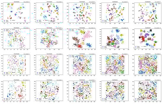 Figure 3 shows the clustering results of all 300 Homberger instances using only spatial features, with . Both the average_distance_to_centroid and cv_distance_to_centroid features were discarded as they are perfectly correlated to depot-based features. In Figure 3, each column corresponds to a given number of clients, while each row shows five subsets of ten instances each. The instances in these subsets differ only in their time window allocation. From this, we notice a successful clustering process using spatial features to discriminate between small, medium, and large problem instances. Larger values of k do not produce more granular distinctions between instance sizes. This is likely due to the lack of inter-instance variance in depot- and centroid-related features.