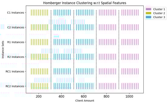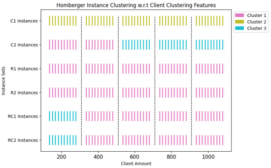 The clustering results of Homberger instances with all extracted features and are shown in Figure 6 and are shown in Figure 7. The correct clustering of instances is most noticeable, as these are the most different from all others due to their distinctive client distributions. In order to understand the differences between clusters 2, 3, and 4, we present Table 2, listing the most decisive features. Only features that present high inter-instance differences have been included. Low and High values are strictly relative. Cluster 4 correctly groups together instances that contain either large or sparse client-clusters; these instances also present high vehicle capacities. Finally, clusters 2 and 3 present very similar values for all features except Capacity, correctly distinguishing between type 1 and 2 instances, which are only different concerning their maximum capacity in the case of R and instances. Cluster 3 does, however, incorrectly include the smaller instances, indicating that the feature set was insufficient to distinguish high-capacity, small, densely clustered instances from high-capacity, large, non-clustered instances. This situation may be solved by including more client-clustering features in the feature set.