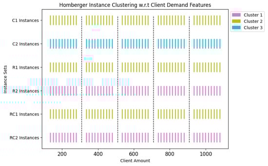 Clustering of Homberger instances with three clusters, using only demand-related features.