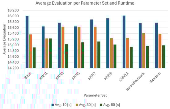 The quality of predicted parameters depends on the runtime limit, as seen in Figure 9. For a 10-second time limit, KNN with one neighbor provides the best result, with a 4% improvement over the base set. For a 30 s time limit, both KNN1, KNN9, and KNN11 provide similarly good results, though the difference between said parameter sets and the base set is nearly negligible. Finally, with a 60 s time limit, the base parameter set provides the best results, with all predicted parameter set evaluations landing within 2% of each other. When considering the three-time limits together, KNN1 provides the best average results (See Figure 10).