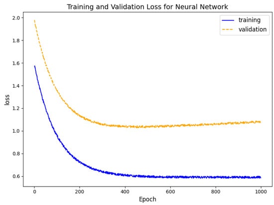 Figure 11 shows the loss curves for the training and validation sets during the training process of the neural network that uses the data concerning all the problem instances. A typical learning rate can be observed in these curves. Starting with a high loss value, the process converges to low loss levels for both training and validation data sets.