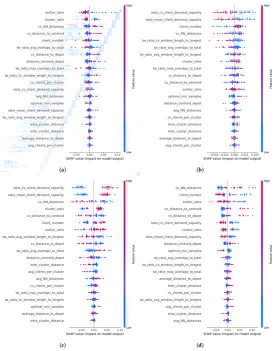 For the prediction of the minimum population size parameter (ps), Figure 12d shows the CV of nearest neighbor distances, client number, and outlier ratio features to be most relevant. Moreover, when predicting the value for the target proportion of feasible solutions (xi), the model’s output is most strongly impacted by the outlier ratio, client number, cluster ratio, and both capacity features (ratio of the CV and mean of client demand w.r.t capacity).