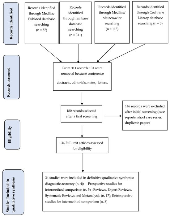 We found a total of 311 articles, and 131 of these were conference abstracts, editorials, notes, letters, short surveys, conference papers and duplicates and were not considered in this review. Among the remaining 180 articles, 146 were case reports, minor clinical studies, and case series and were excluded. Table 1 reports 34 articles that were classified as major clinical studies according to EMBASE grouping criteria.