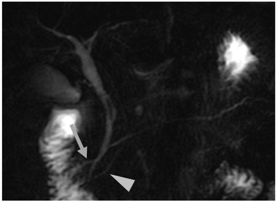 MRCP showing a case of complete pancreas divisum (type 1): absence of communication between the main pancreatic duct and Wirsung’s duct (head of arrow); dominant dorsal duct drainage in the minor papilla (grey arrow). The biliary tract crosses the main pancreatic duct.