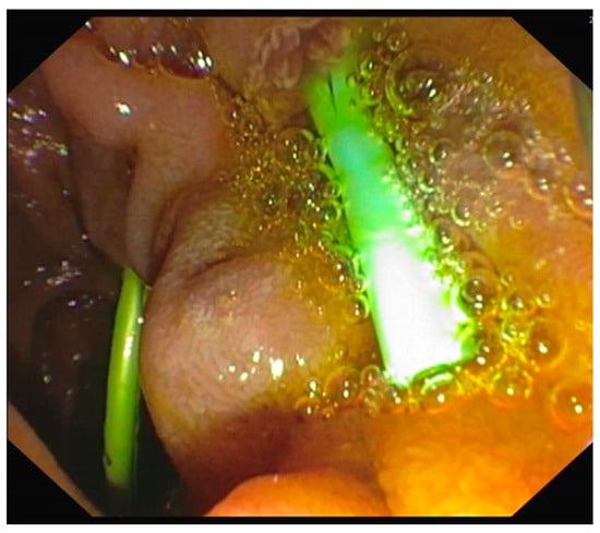 Over the next two years, the patient underwent four replacements of the pancreatic stent without any complications. In August 2021, the patient was re-hospitalized after developing acute pancreatitis with enlargement of the known pancreatic collection (64 × 52 mm vs. 20 mm), which showed an infected and granular appearance on CECT. WBC were 14,500 cells/μL and CRP was 32 mg/dL (normal values < 0.7 mg/dL). He subsequently underwent EUS, which identified a large heterogeneous retro-gastric collection of at least 6 cm. EUS-guided access was performed using a 15 × 10 mm metal stent (Hot Axios), obtaining purulent material outflow (Figure 6). The subsequent ERCP demonstrated the minor papilla with a pancreatic stent in place; the Vater’s papilla appeared normal. The pancreatic stent was removed. Pancreatography did not show contrast medium leaks; the Santorini duct appeared regular in calibre and course. A 7 Fr, 5 cm stent was then repositioned through the minor papilla, with effective drainage of pancreatic juice into the duodenum. An 8.5 French catheter was placed in the collection to drain it at the end of the procedure. Smooth haemostasis was achieved. Inflammatory markers improved along with the clinical condition. Before discharge, an ERCP confirmed the presence of a metal stent in the posterior gastric wall. This provided access to the previously abscessed retrogastric collection, which appeared well-drained and small. A double-pigtail plastic stent, type Solus, with a diameter of 10 Fr and a length of 3 cm, was placed, one coil in the retrogastric cavity and the other in the stomach.