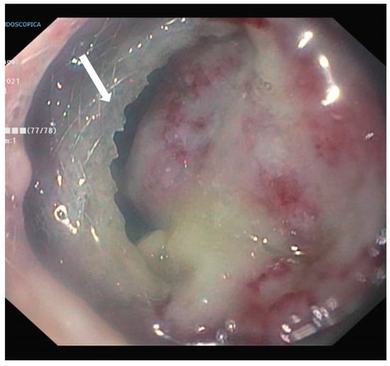Endoscopic view of the lumen-apposing metal stent in place (white arrow, Hot Axios™ (Boston Scientific, Boston, MA, USA)) draining purulent material.