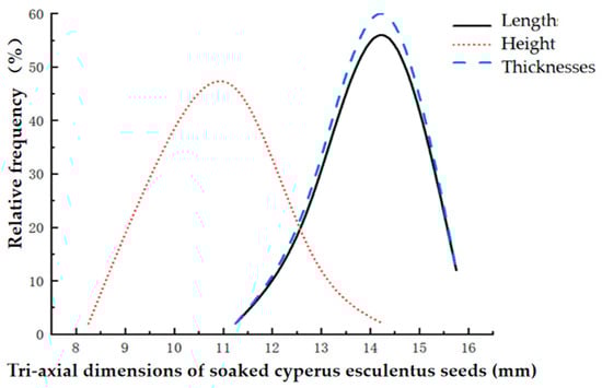The triaxial dimensions of C. esculentus seeds after soaking were analyzed using Origin 2024 and were found to be approximately normally distributed, as shown in Figure 3.
