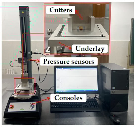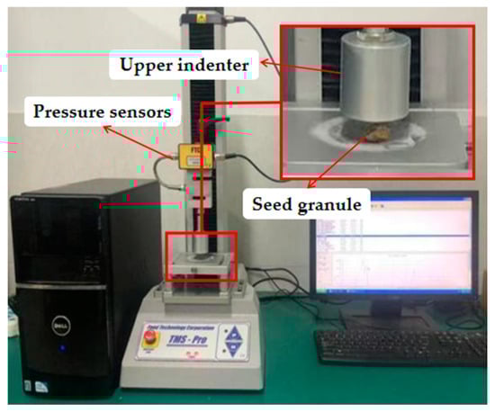 The magnitude of the shear modulus is a physical quantity that describes the ability of a seed to resist shear deformation [21]. In this paper, an FTC texture meter (TMS-Touch) was used for the extrusion test. During the testing process, soaked C. esculentus seeds were selected and measured using electronic vernier calipers (accuracy of 0.01 mm) to determine their three-axis dimensions. The seeds were placed on the test platform with an initial loading force of 0.3 N and a loading speed of 1.5 mm/min. The computer automatically recorded the pressure change over time during the test. The test was repeated 10 times. The modulus of elasticity of soaked C. esculentus seeds was calculated using Equation (4), and the test setup is shown in Figure 5.