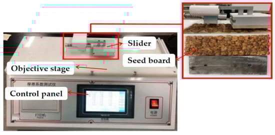 The coefficient of friction is the nature of the friction between the seed and the contacting surface that produces relative sliding. The determination of the coefficient of friction is one of the important parameters related to the material used to design the seed discharger. The static and dynamic friction coefficients of the test medium for the C. esculentus seeds (steel plates) were determined using a dynamic friction coefficient tester (Xiamen Oriental Instrument Co., Ltd., Xiamen, China, ST-MXZ-1 type). Selected C. esculentus seeds of close size in three axes were peeled, and the skin was tightly fitted on the plate using a strong adhesive. After resting on the seed plate, fitting on the plate took place, resulting in two samples (one on the next). The whole system consisted of the objective stage, control panel, seed plate, drag mechanism, and slider composition. The test device is shown in Figure 6.