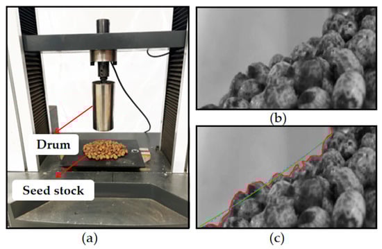 Determination of the physical angle of accretion of C. esculentus seeds: (a) determination of simulated stacking angle of soaked C. esculentus seeds; (b) gray-scale processing; (c) extracting contours to fit straight lines.