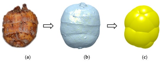 Determination of the physical angle of accretion of C. esculentus seeds: (a) soaked C. esculentus seed; (b) outline model of C. esculentus seed; (c) discrete meta-modeling of C. esculentus seed.