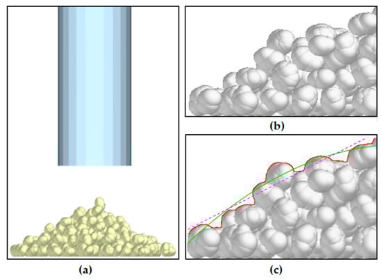 The stacking-angle instrument was mapped according to the actual size of the three-dimensional mapping; the drawn three-dimensional model was simplified and imported into the EDEM software. The intrinsic characteristics of the C. esculentus seeds obtained from the test and the contact parameters were entered into the EDEM; the parameters of the steel plate are shown in Table 1 [31,32]. The particle generation method adopts the normal distribution method, the uniform time in the cylinder to generate 550 seeds, and a precipitation of 0.8 s. All the particles fall into the cylinder, which slowly lifts at a speed of 0.04 m/s. The total length of the simulation is 5 s, which results in the formation of a stable seed pile at the end of the test. An image is collected, and Matlab software is used to determine the population simulation stacking angle and record the tangent value, as shown in Figure 10.