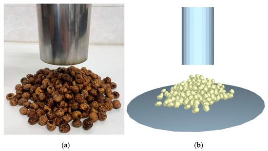 The test was conducted using the bottomless hollow circular steel cylinder lifting method [25,26,27]. The cylindrical cylinder specifications were determined according to the size of the soaked C. esculentus seeds; it had an inner diameter and height of 70 mm and 150 mm, respectively. The lifting speed should not be too fast; through the pre-test, we observed the stacking morphology and comprehensively considered the subsequent simulation to be time-consuming. The experiments were conducted using a lifting speed of 0.04 m/s. In order to ensure that the cylindrical cylinder lifted at a uniform speed, the cylinder was fixed in the texture meter. In order to ensure that the cylindrical cylinder was lifted at a uniform speed, the drum was fixed on the texture apparatus, and the seeds gradually leaked out from the bottom of the drum to form an approximate conical seed pile.