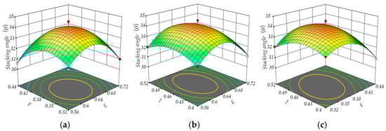 Effect of two-way interactions of factors on the angle of repose of C. esculentus seeds: (a) response surface of population stacking angle for interspecies interactions of static and rolling friction coefficients; (b) response surface of population stacking angle for interaction of interspecies static friction coefficient and seed–plate rolling friction coefficient; (c) response surface of population stacking angle for interspecies interaction of rolling friction coefficient and seed–plate rolling friction coefficient.