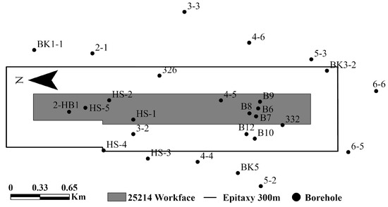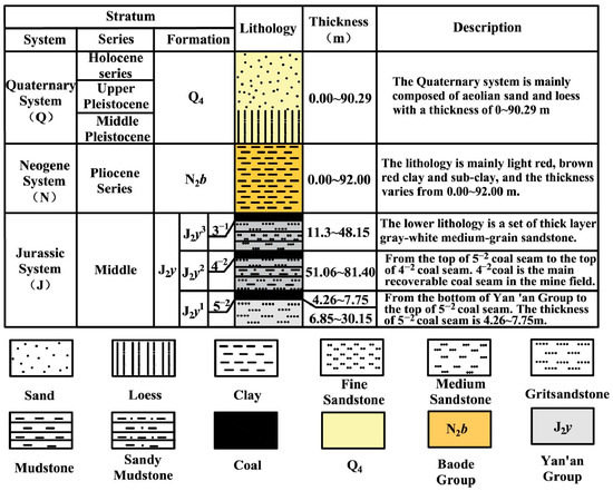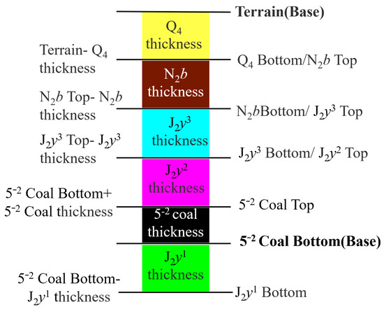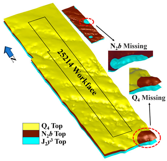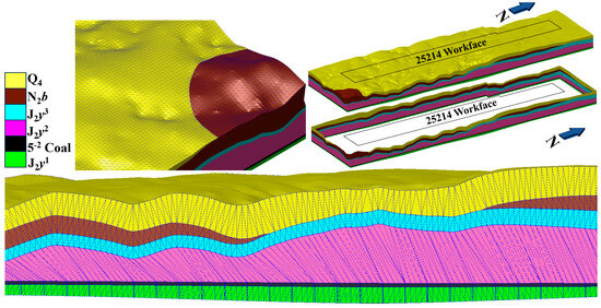 Borehole data, collected over a 300 m near the 25214 workface (Figure 3), indicates the presence of Quaternary (Q4), Neogene Baode Formation (N2b), and Jurassic Yan’an Formation (J2y) strata. The Quaternary system consists primarily of Holocene eolian sand deposits and Lishi Formation loess. The red soil of the Baode Formation constitutes the principal aquiclude in the workface roof. Near the 25214 workface, erosion has removed J2y5 and J2y4 strata, leaving only J2y3, J2y2, and J2y1. The primary coal seams cap each of these sections: 3−1 Coal sits atop J2y3, 4−2 Coal above J2y2, and 5−2 Coal crowns J2y1. The main mining face 25214 is extracting from the 5−2 coal, therefore no interpolation has been conducted for the 3−1 and 4−2 coal. This study primarily evaluates the topography Q4, N2b, J2y3, J2y2, 5−2 Coal, and J2y1.