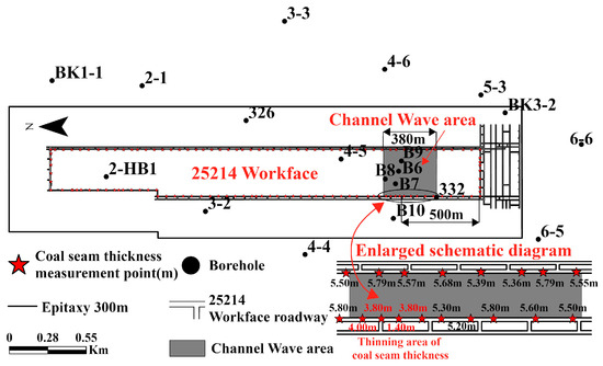 The interpolation data for coal seam thickness in the 25214 workface were obtained from multiple sources, including borehole measurements, roadway exposure measurements during tunnel excavation (Figure 6), and channel wave exploration inversion results. During tunnel excavation, coal seam thickness was measured along the roadway with an average spacing of approximately 50 m between measurement points. These measurements were used to assist in roadway positioning and adjust the excavation direction. Notably, seam thinning was observed approximately 500 m from the retreat support roadway, where a sandstone scour zone had eroded the seam. To further delineate this thinning anomaly, channel wave exploration was conducted within the range of 310–690 m from the retreat roadway, and the seam thickness was inferred by inverting the channel wave group velocity.