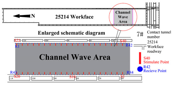 The layout for the channel wave exploration at 25214 workface is depicted in Figure 7. Twenty shot points and forty-two receiver points were planned for each of the two survey lines. Shot points were spaced 20 m apart, and receiver points 10 m apart. In practice, shots S21 and S25 were not fired, resulting in data acquisition from 38 shots and 1596 data points (Table 2).