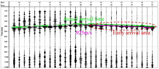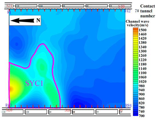 The channel wave exploration results indicate that the coal seam thinning zone correlates with a high-velocity anomaly. Figure 8 presents the seismic record for shot S11 in the 25214 workface. The magenta line represents an auxiliary line at 925 m/s, while the green line demonstrates the actual arrival time of each channel wave. From this figure, the channel wave velocity is approximately 925 m/s for receivers 1 through 29. However, arrivals at receivers 30 through 42 exhibit an earlier arrival time, indicating a velocity increase and, therefore, coal seam thinning. Picking different channel waves produces the velocity distribution across the workface (Figure 9). While the channel wave velocity is generally stable, the data define an anomalous high-velocity range, referred to as SYC1.
