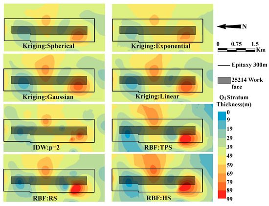 Interpolation Results for Stratigraphic Thickness Data: For stratigraphic thickness data with sparse sampling points, the optimal interpolation methods for five strata are as follows: For Q4 stratum, spherical kriging (MAE = 2.13 m, RMSE = 2.83 m); for N2b stratum, IDW (p = 2) (MAE = 2.08, RMSE = 2.44); for J2y3 stratum, RS-RBF (MAE = 0.89 m, RMSE = 1.05 m); for J2y2 stratum, TPS-RBF (MAE = 1.96 m, RMSE = 2.25 m); and for J2y1 stratum, HS-RBF (MAE = 2.36 m, RMSE = 2.71 m).