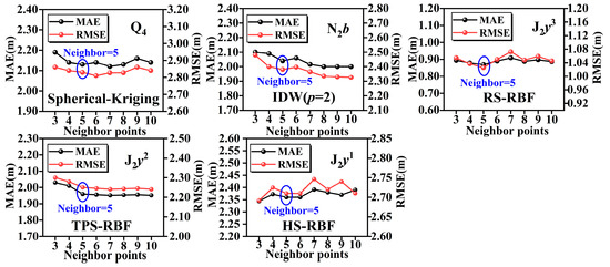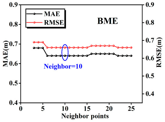 According to the results of BME parameter sensitivity experiments (Figure 19), the accuracy of the model (MAE and RMSE) tends to be stable when the number of neighbor points exceeds 5, and it performs best at 10 neighbor points. This result shows that there is a sensitivity between the interpolation accuracy of the BME method and the number of neighbor points, and in this experiment, 10 neighbor points were selected as the best balance points.