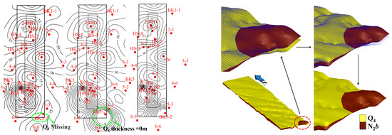 Furthermore, local absences of certain strata, particularly Q4 and N2b, were observed in some boreholes, indicating erosional truncation or non-deposition in specific areas. These spatial discontinuities further highlight the heterogeneity in the overlying strata. Collectively, these stratigraphic data provide the fundamental basis for subsequent geological modeling and interpolation analyses.