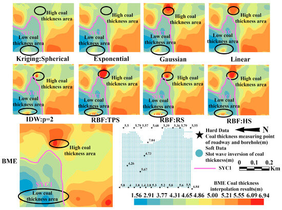 Eight interpolation methods, including kriging, IDW, and RBF, cannot accommodate data uncertainty during the interpolation process. Therefore, when interpolating coal thickness, data from channel wave inversion, borehole data, and mine roadway data were incorporated as input sources. The MAE and RMSE values for the nine interpolation methods are lower (Table 6) accordingly with the uniform distribution and gridded output of the geophysically inverted coal thickness data. The BME method has the highest accuracy but consumes more time and memory than the other eight algorithms, which is determined by the computational complexity of the BME algorithm itself. The time consumption is 83.57 s and the memory consumption is 387 KB. Figure 18 illustrates that BME interpolation offers greater precision in areas where the coal seam thins and in the vicinity of the maximum coal thickness of 7.04 m, effectively capturing localized differences in the coal seam. This enhanced performance is attributed to the inability of the other eight methods to utilize coal thickness data uncertainty; thus, these data are treated as “Hard Data” during interpolation, leading to greater discrepancies between interpolated and observed values. BME interpolation, in contrast, incorporates both “Hard Data” and “Soft Data”, utilizing uncertainty intervals and analyzing interpolation weights at various locations to achieve an optimal solution. Accordingly, BME interpolation was chosen for accurate coal thickness predictions in the channel wave exploration area, while spherical kriging was applied to predict coal thickness in other sections of the 25214 workface.