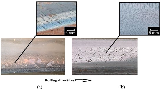 At the same time, in the middle part of the rail head, such surface cracks are located chaotically (Figure 1b), which indicates that the wheels slip relative to the rail which occurs in various directions and the entire rolling surface is subjected to work hardening. At the same time, in the central part of the rail head, such surface cracks are distributed chaotically (Figure 1b), indicating that wheel slippage relative to the rail occurs in various directions and the entire running surface is subjected to work hardening. The thickness of the work-hardened layer depends on the properties of the rail and wheel materials, their relative hardness, technological stresses, temperature, etc., and can reach several millimeters.