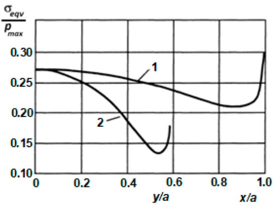 Figure 3 [26] illustrates how, under the above conditions, the relative equivalent stress varies at points along the semi-axes of the ellipse.